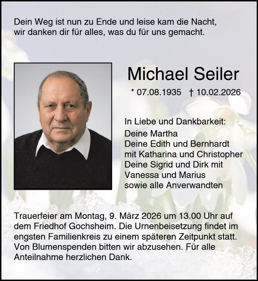 Lieber Michael, lieber Papa, nun ist dein Weg hier auf Erden zu Ende und wir werden dich sehr, sehr vermissen. Du hast zuletzt starke Schmerzen erleiden müssen, so dass es dir dort, wo du jetzt bist besser geht. Wir werden dich sehr vermissen, deine positive Lebenseinstellung, dein Tatendrang und deine Entschlossenheit, sowie deine unendliche Liebe für deine Familie.